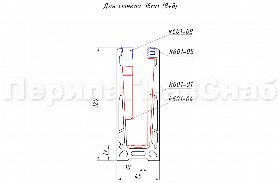 k601 — профиль для ограждений на несущем стекле (для стеклянных ограждений). Алюминиевый профиль чаще всего используется при строительстве таких объектов, как торговые дома, бизнес-центры, отели, спортивные сооружения. Максимально допустимая высота ограждения может доходить до 1200 мм, боковая нагрузка – до 430 кг. В данной модификации профиля предусмотрены крепежные отверстия. Наличие крепежных отверстий гарантирует более удобную и быструю установку профиля на объекте.