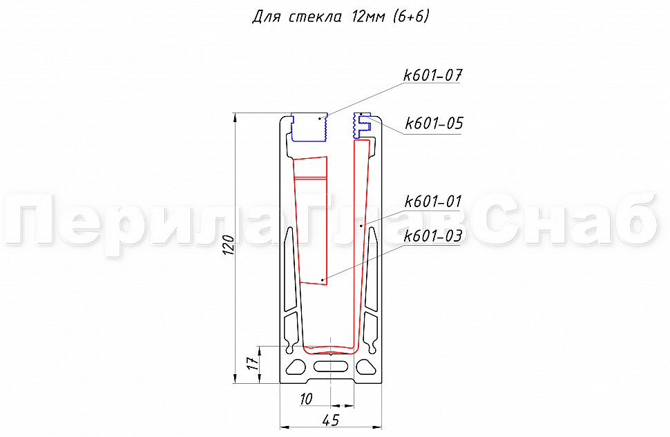 k601 — профиль для ограждений на несущем стекле ( для стеклянных ограждений). Алюминиевый профиль чаще всего используется при строительстве таких объектов, как торговые дома, бизнес-центры, отели, спортивные сооружения. Максимально допустимая высота ограждения может доходить до 1200 мм, боковая нагрузка – до 430 кг.