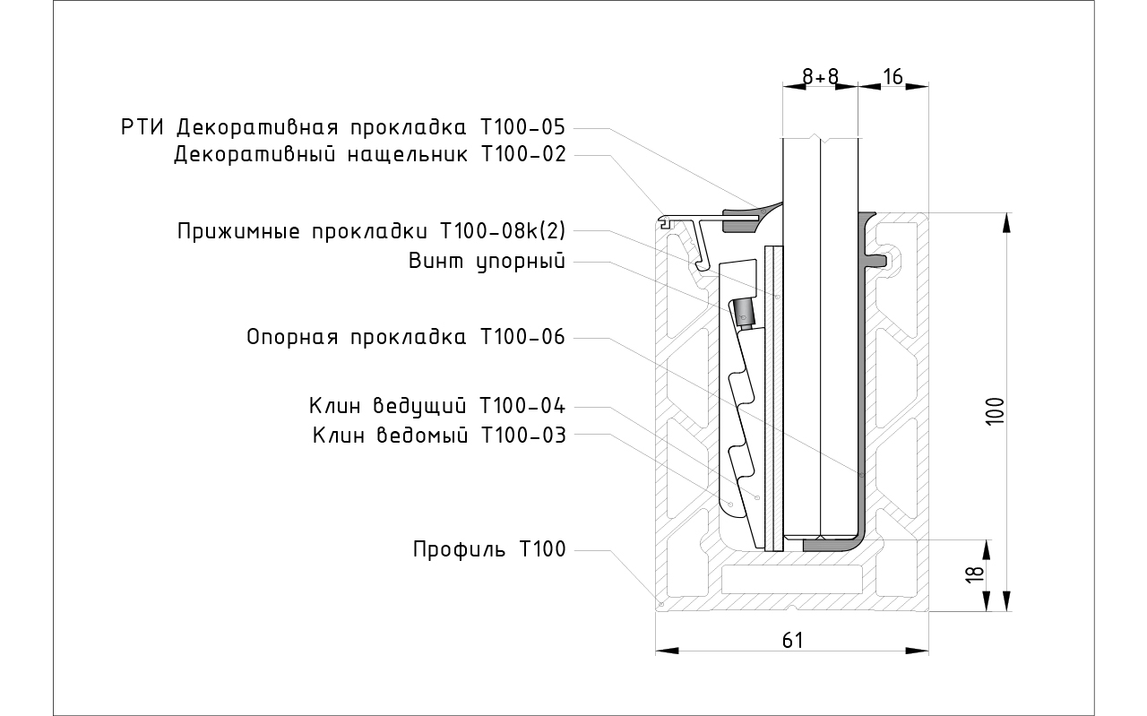 Системы зажимных алюминиевых профилей т100 предназначены для 8 типов размеров зажимаемых закаленных стекол: 10мм, 12мм, 16мм, 20мм, а также триплекса 5+5мм, 6+6мм, 8+8мм, 10+10мм