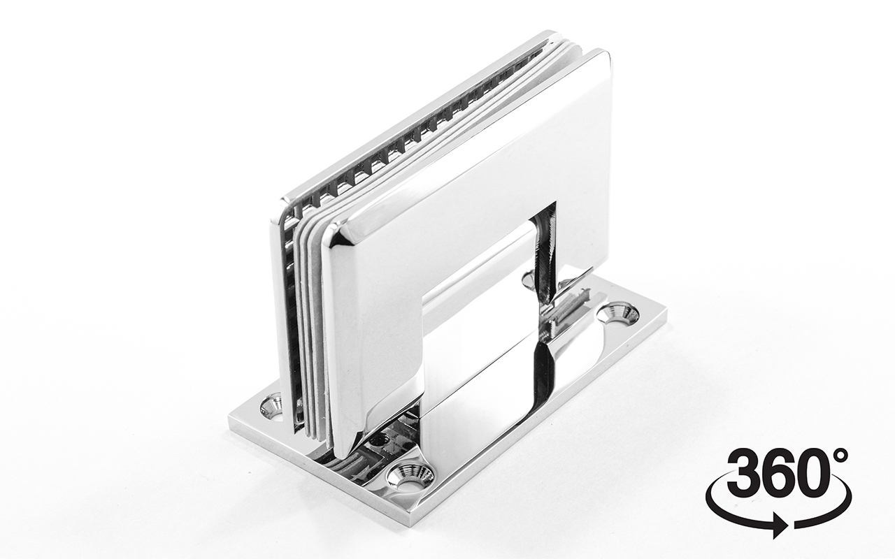 Петля стена-стекло для соединения стеклянной двери душевой кабины со стеной ванной комнаты. Двухстороннее крепление позволяет устойчиво закрепить петлю на стене и уверенно открывать и закрывать дверь в обе стороны. Максимальный угол разведения стыковочных элементов в плане составляет 90°. Масса двери может составлять 35 кг на две петли.