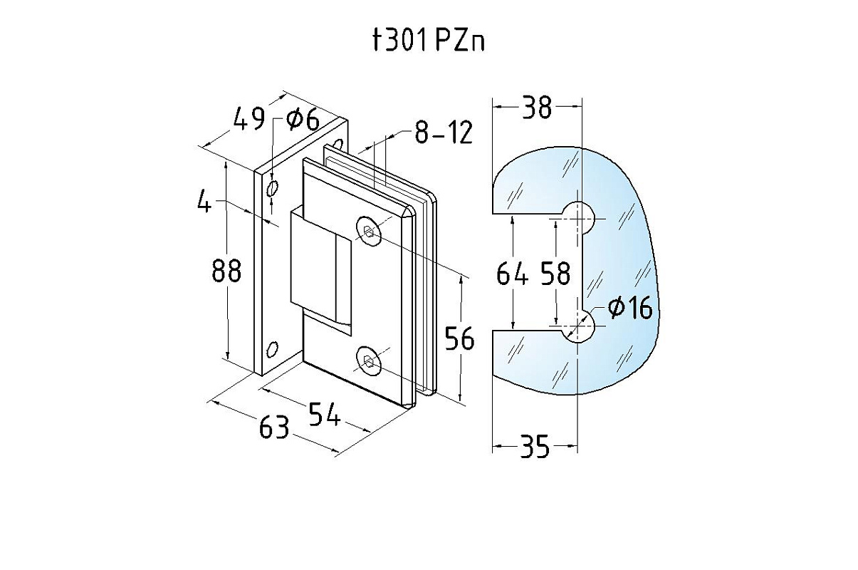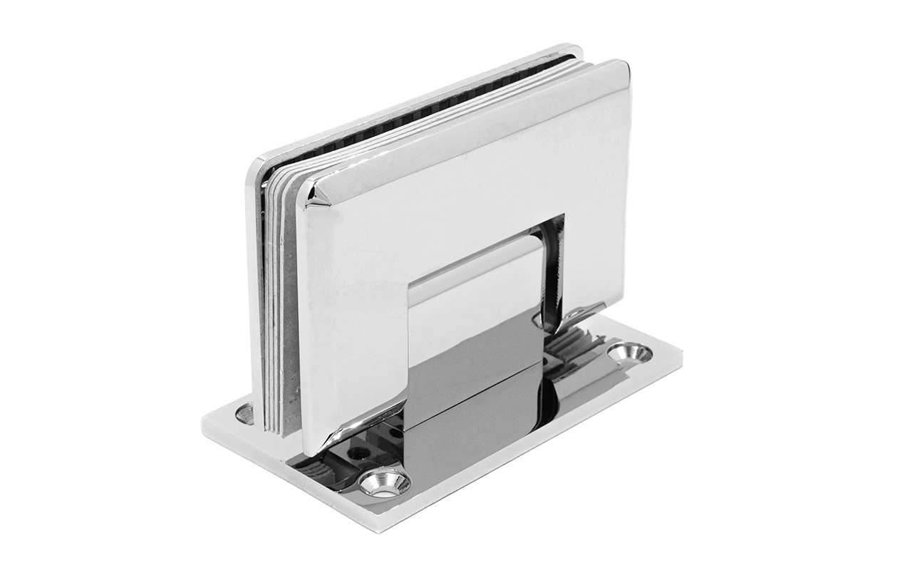 Петля стена-стекло для соединения стеклянной двери душевой кабины со стеной ванной комнаты. Двухстороннее крепление позволяет устойчиво закрепить петлю на стене и уверенно открывать и закрывать дверь в обе стороны. Максимальный угол разведения стыковочных элементов в плане составляет 90°. Масса двери может составлять 35 кг на две петли.