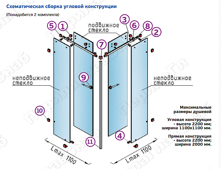 Комплект раздвижной системы для душевой, AISI 304, шлифованный. Толщина стекла равна 8 мм. Максимальный вес двери на одну каретку равен 60 кг.