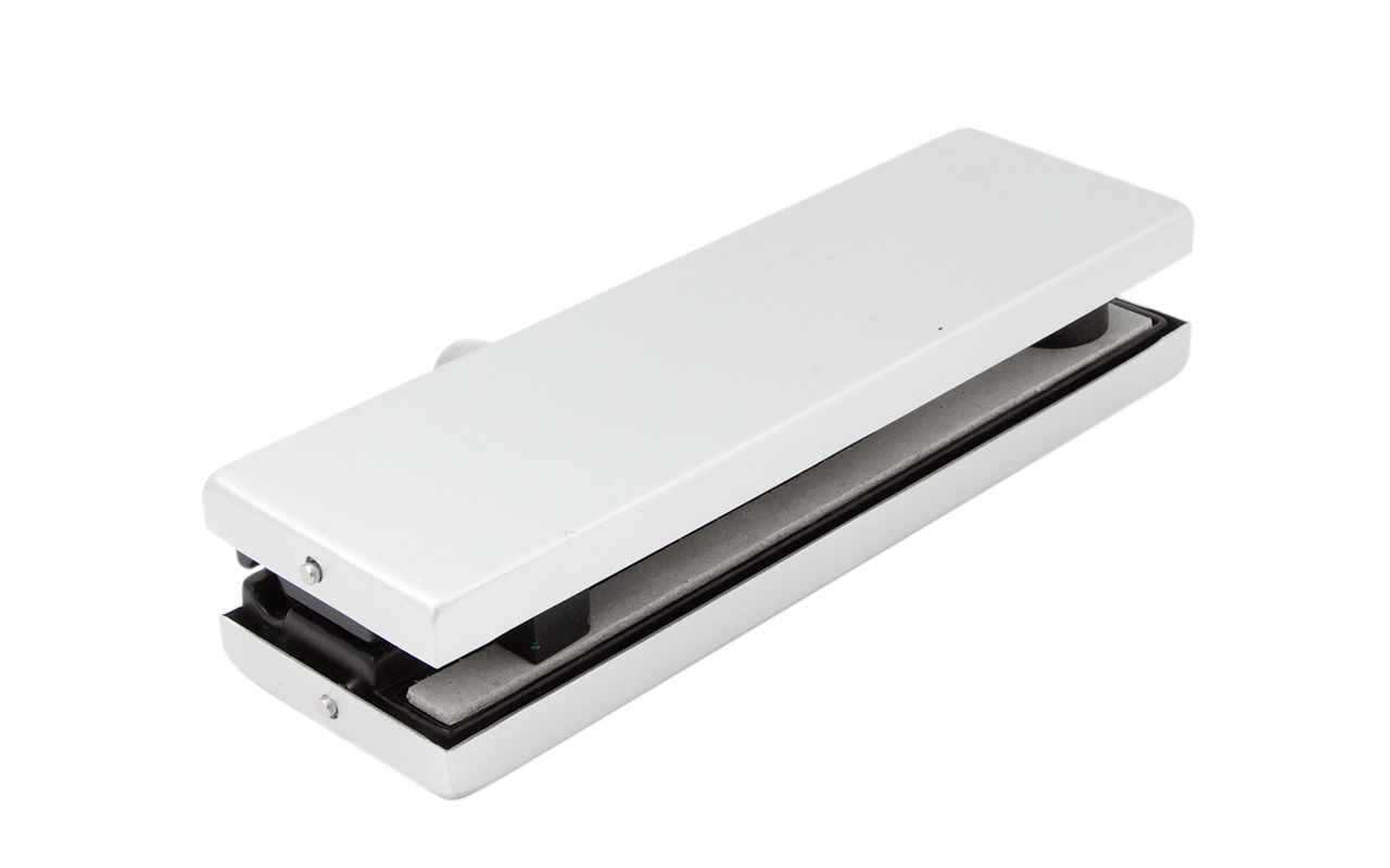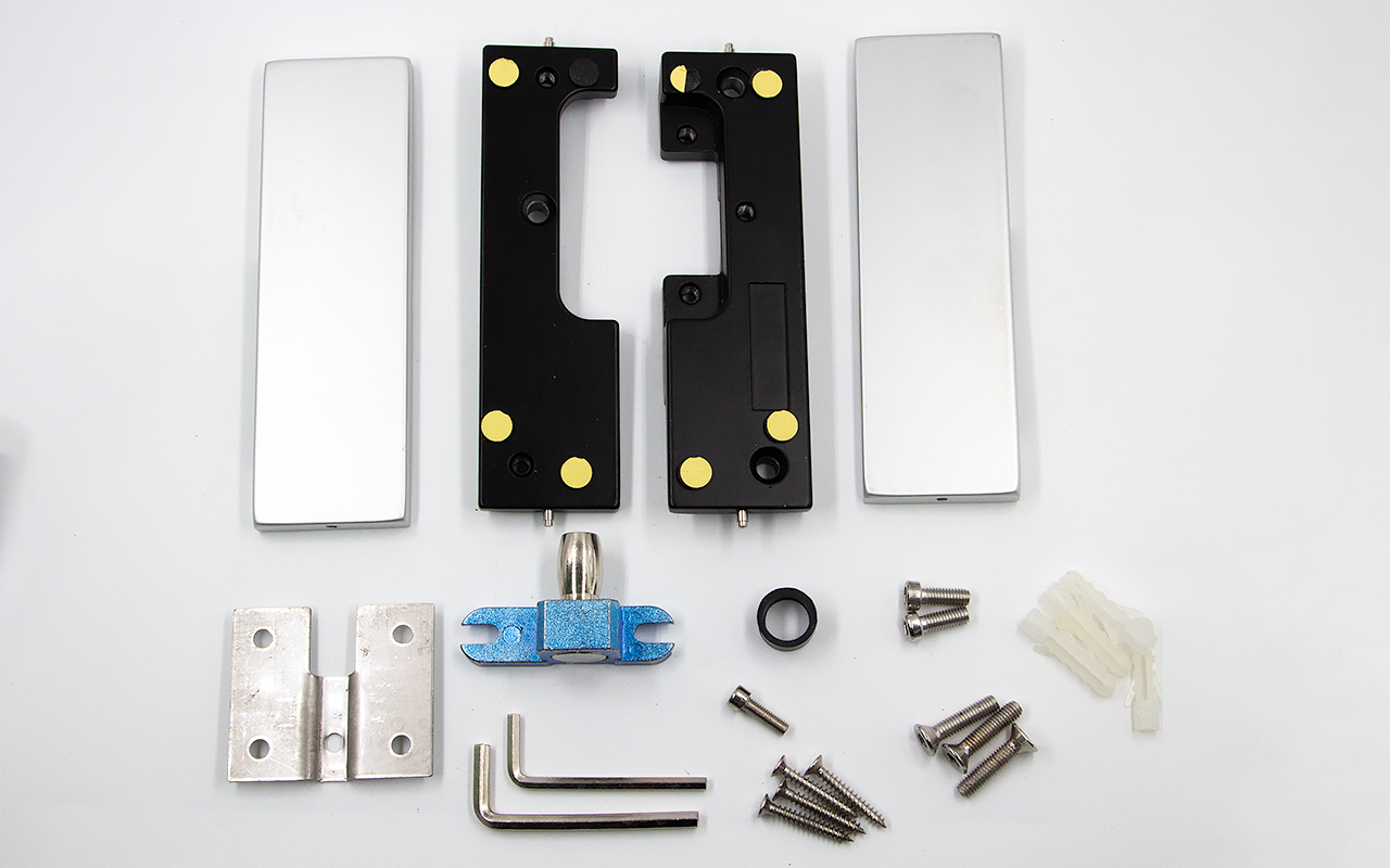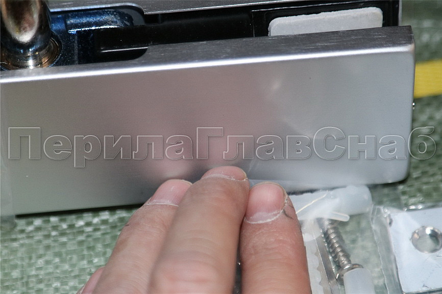 фиксируем к стене дюбель саморезами, далее сбоку нажимаем на крепления крышек и снимаем. Отвинчиваем винты, и фиксируем фитинг в подготовленный вырез в стекле. Далее закручиваем и фиксируем обратно крышки.
