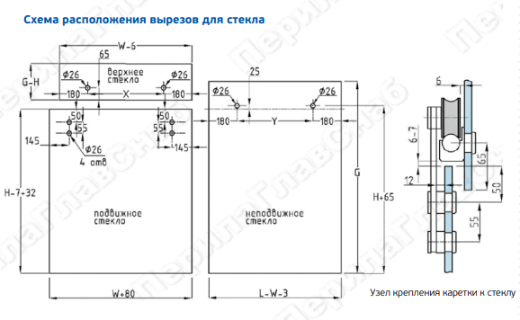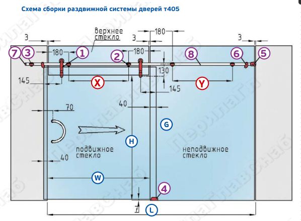 Толщина стекла лежит в диапазоне 10 -12 мм. В один комплект входит: каретка (2 шт.), крепление трека к стеклу (4 шт.), напольная направляющая двери (1 шт.), стопор для каретки (2 шт.), заглушка трека (2 шт.). На расчет расстояния между креплениями трека оказывают влияние: вес двери, ширина прохода, ширина стенового портала, высота неподвижного стекла, а также высота общая (от нижнего края фрамуги до пола).