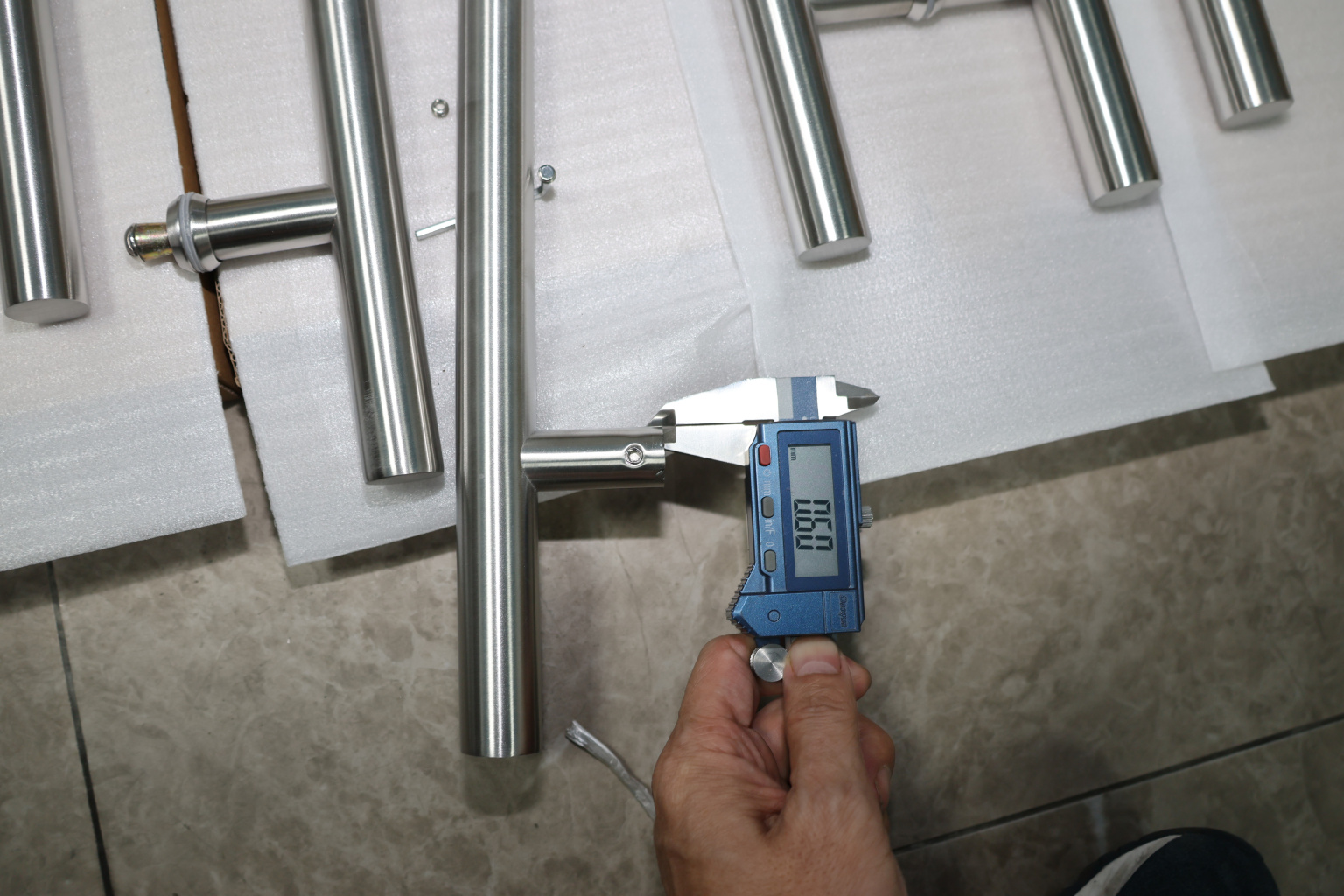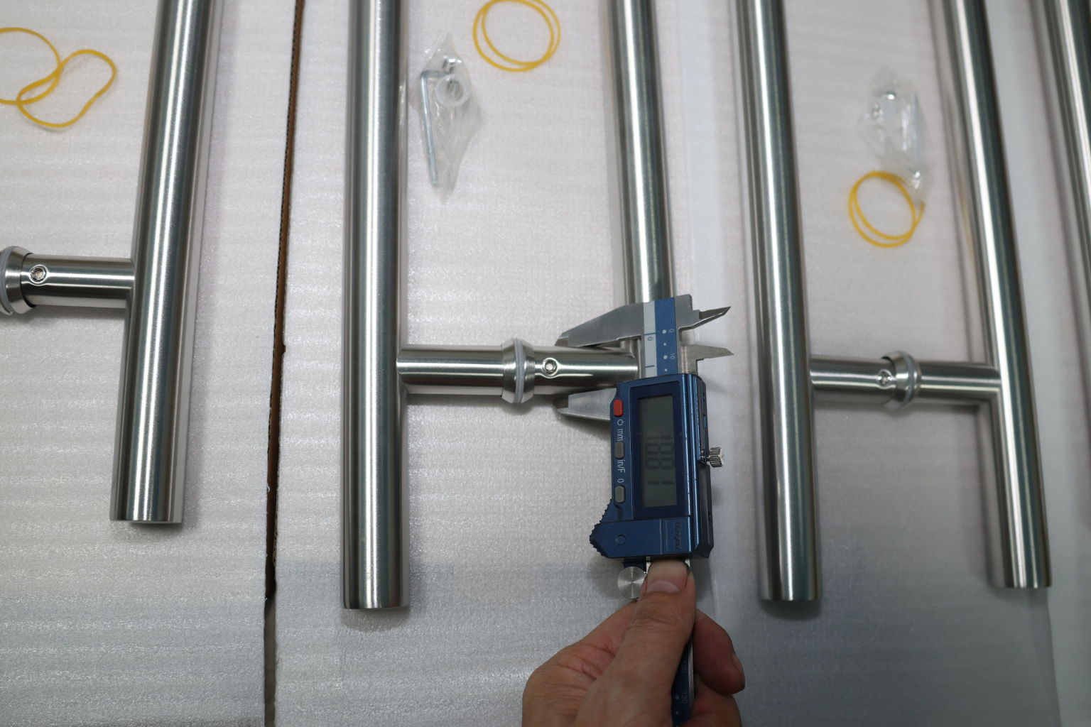 у основания ручки откручиваем с помощью шестигранника винты, делим ручку на две части, в заранее заготовленные отверстия вырезы в стекле 10-12 мм фиксируем первую часть ручки в отверстиях и с обратной стороны ответную часть затягиваем с помощью шестигранника