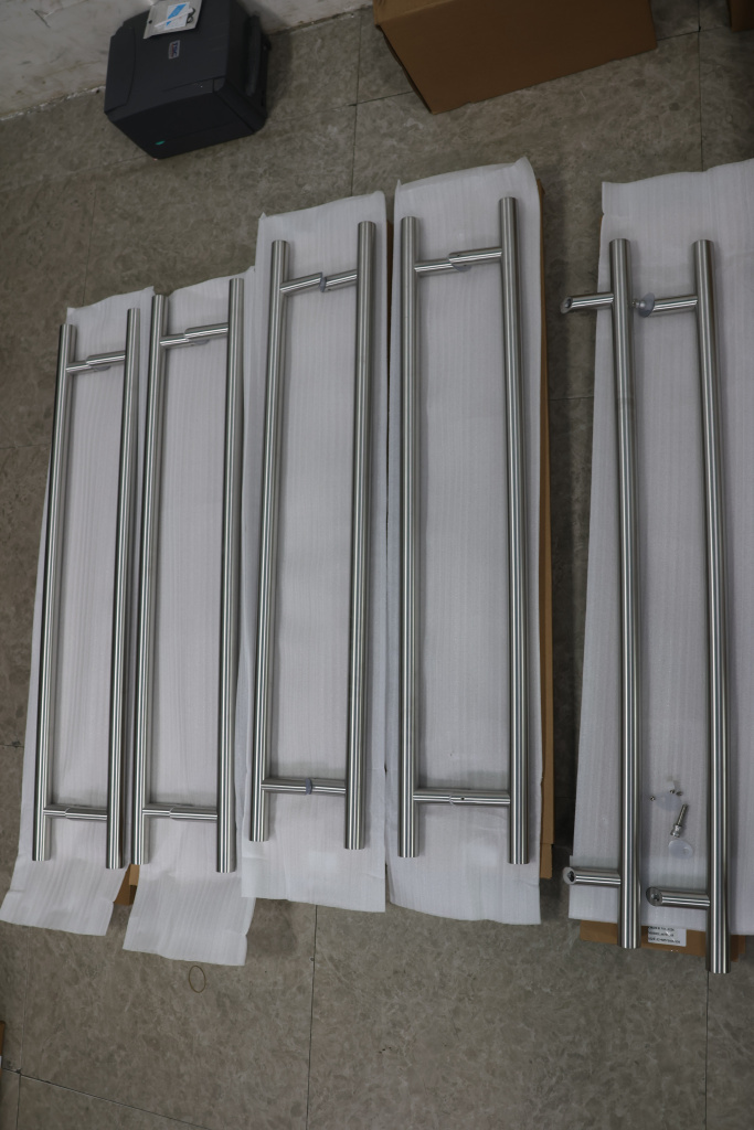 у основания ручки откручиваем с помощью шестигранника винты, делим ручку на две части, в заранее заготовленные отверстия вырезы в стекле 10-12 мм фиксируем первую часть ручки в отверстиях и с обратной стороны ответную часть затягиваем с помощью шестигранника