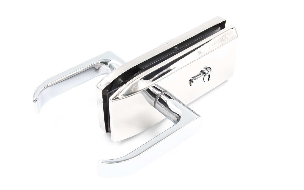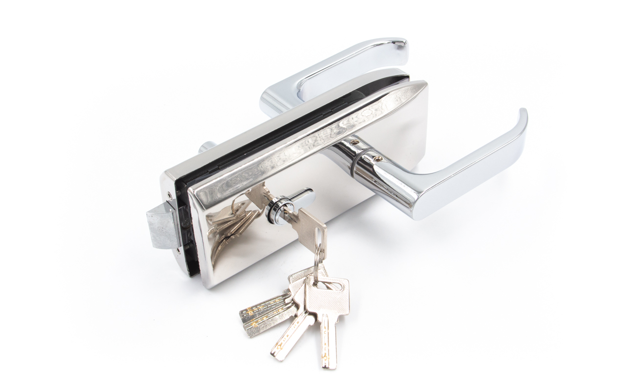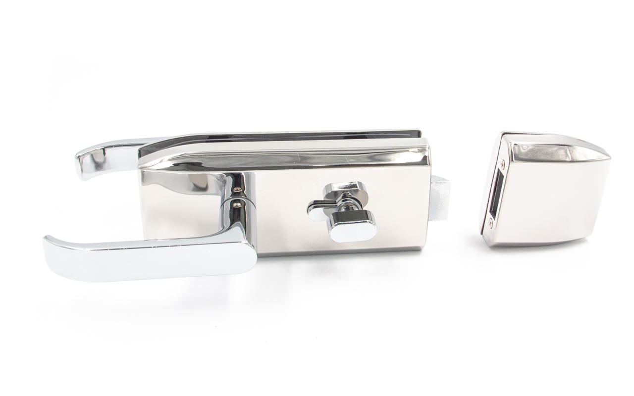 Замок с нажимной ручкой монтируется на стеклянную дверь, толщина стекла 8-12 мм.