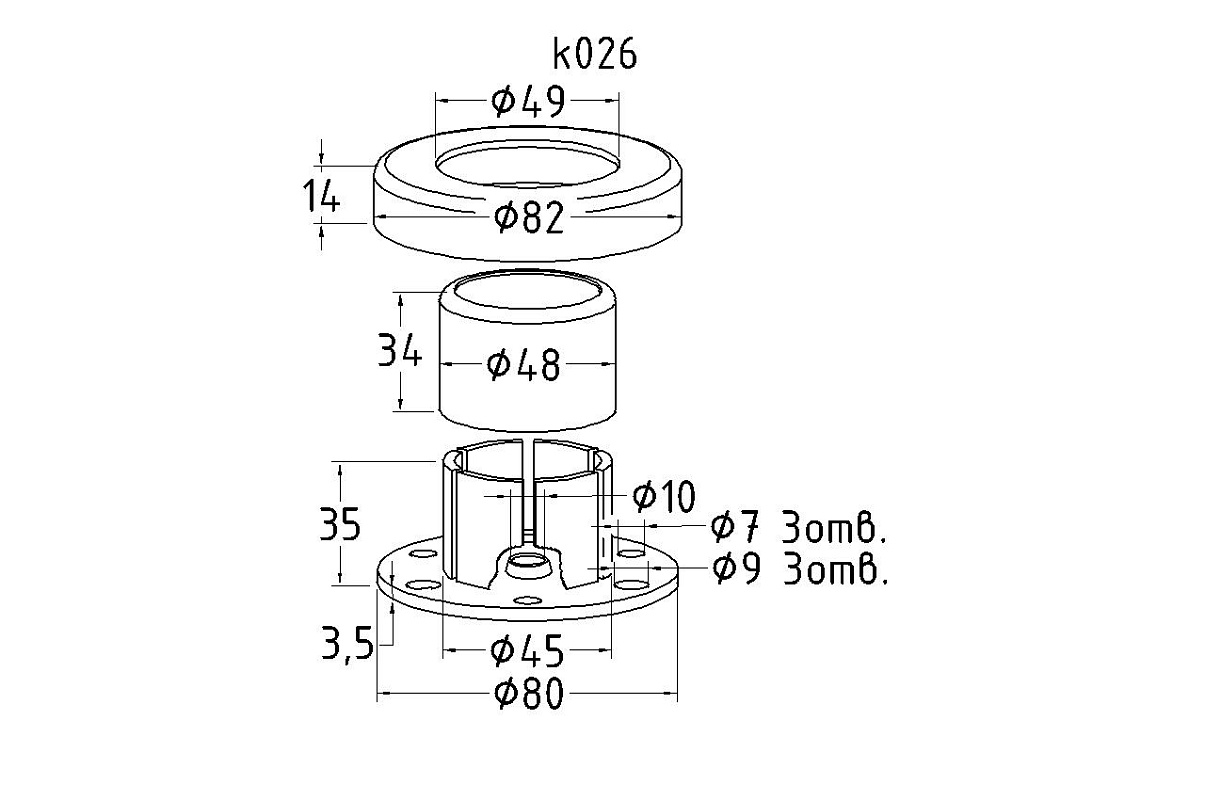 Цанга для крепления стоек из трубы Ø38.1 мм ( k819, k849). Крепится на 3 анкера М8 или на один по центру для надежной установки на деревянную ступень, плитку, бетон. В комплект входят две декоративные крышки.