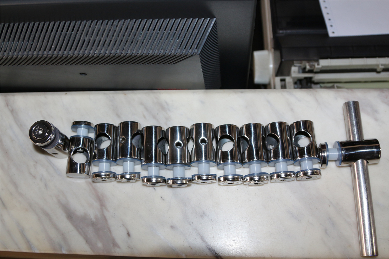 Ригеледержатель крепится насквозь к квадратной трубе стойки, входящим в комплект поставки стяжным винтом М8.Таким образом, с одонй стороны стойки видна шайба, а с другой — корпус ригеледержателя (бочонок) с зажатым внутри него ригелем.