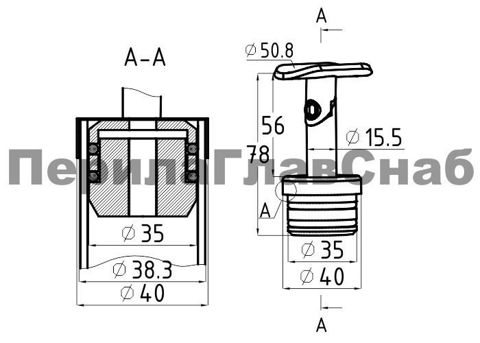 Наконечник-"палец" с алюминиевой системой фиксации на стойке Ø38.1х1.5 мм. Ложемент под поручень Ø50.8 мм, регулируемый. Деталь полированная, литая, нержавеющая. Марка стали - AISI 304