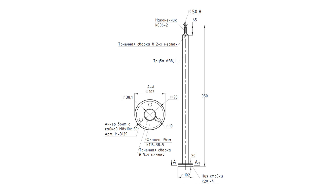 Готовая стойка Ø38,1 мм, с фланцем и наконечником, высота 950 мм, полированная (AISI 304) k702