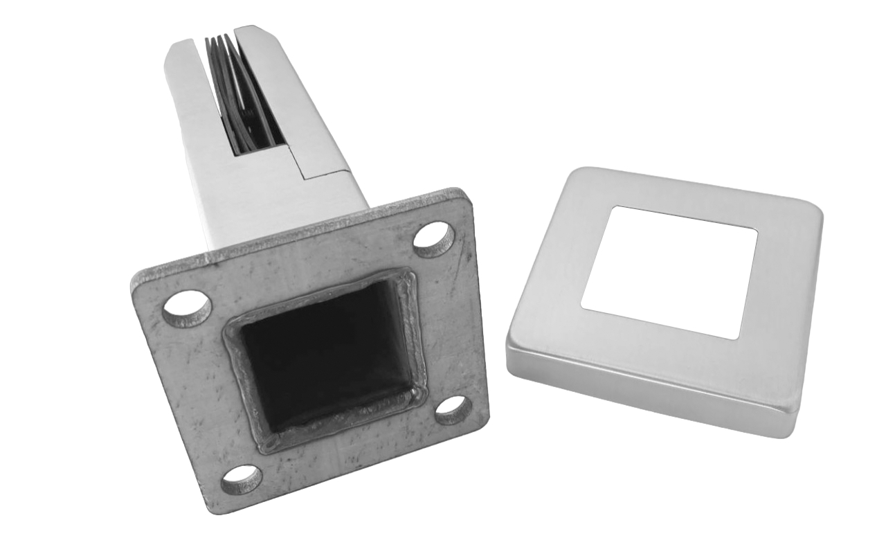 Особый интерес эта модель вызывает благодаря возможности создания ограждений без использования стоек, так как корпус нержавеющей детали монтируется прямо в пол.
