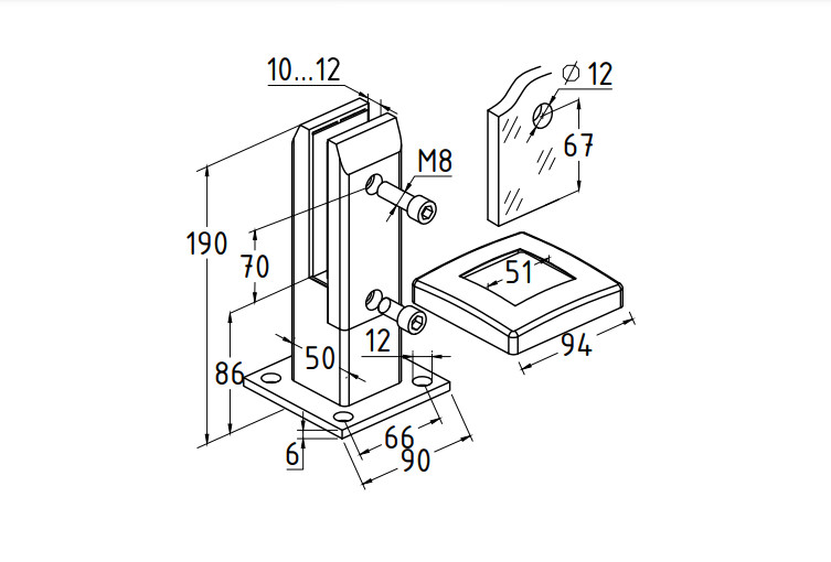 Предназначен для установки стеклянного ограждения высотой до 1200мм. Подходит под стекло 10-12 мм.