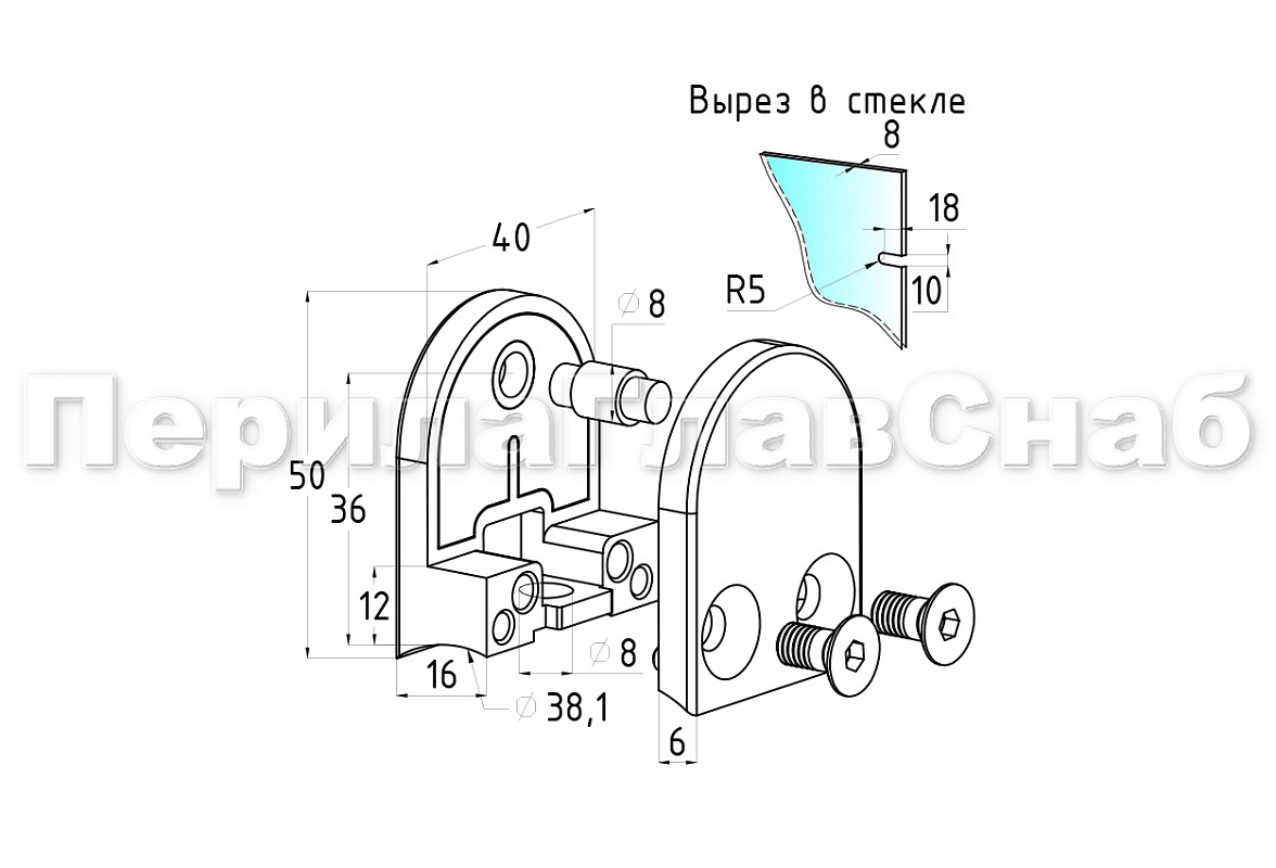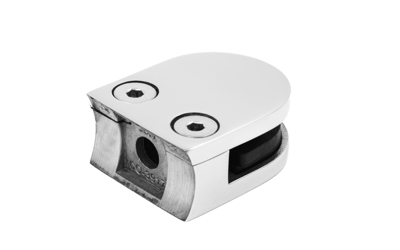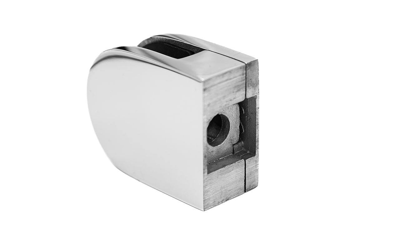 Стеклодержатель литой с вставками под стекло 8-10 мм, 4+4 мм, закругленный под стойку Ø38.1 мм (40х22х50), полированный. Марка стали - AISI 304.