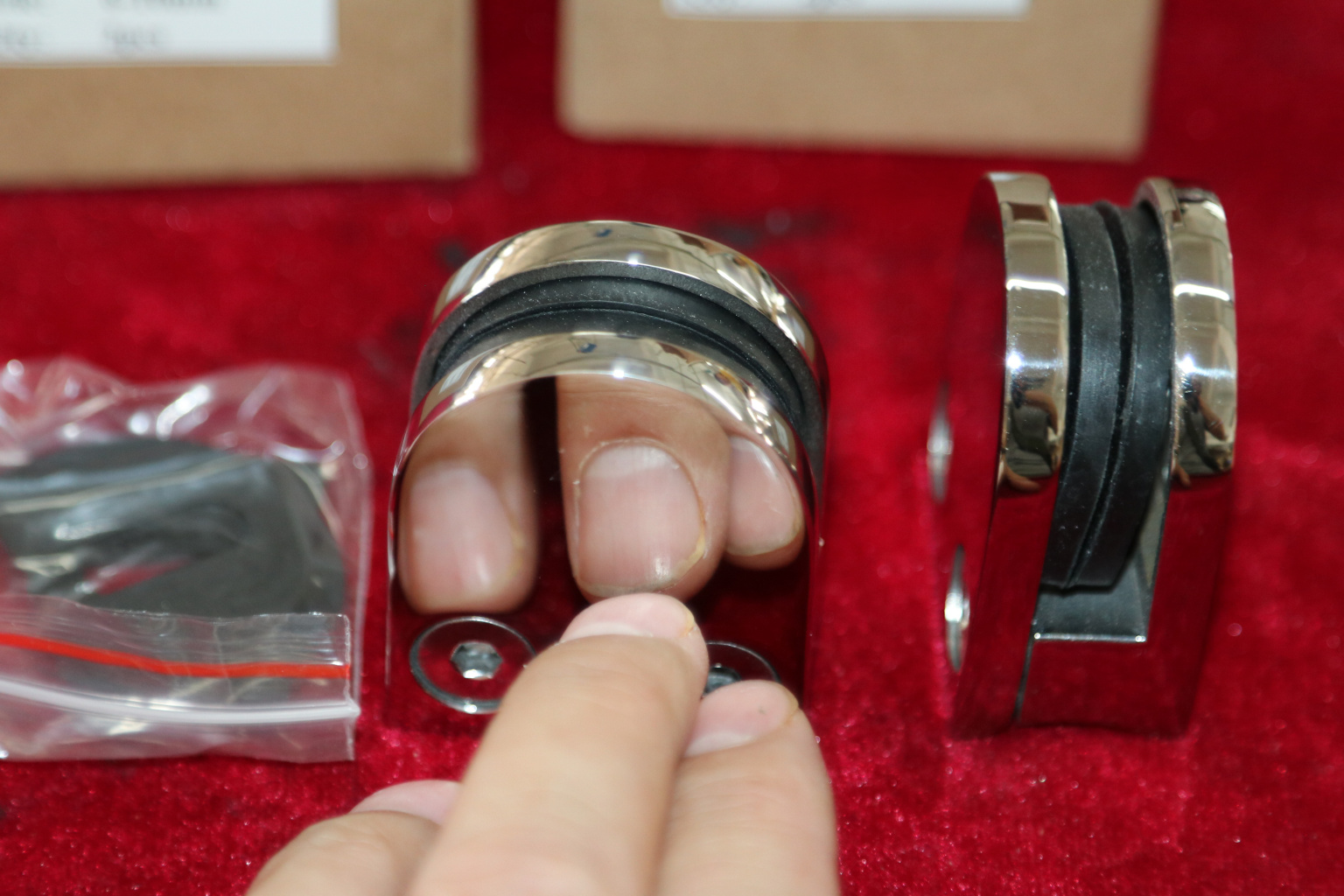Вторая часть стеклодержателя присоединяется к первой входящими в комплект специальными винтами под шестигранный ключ. В этот момент стекло зажимается между двумя половинками детали специальными высокотехнологичными уплотнителями из EPDM.