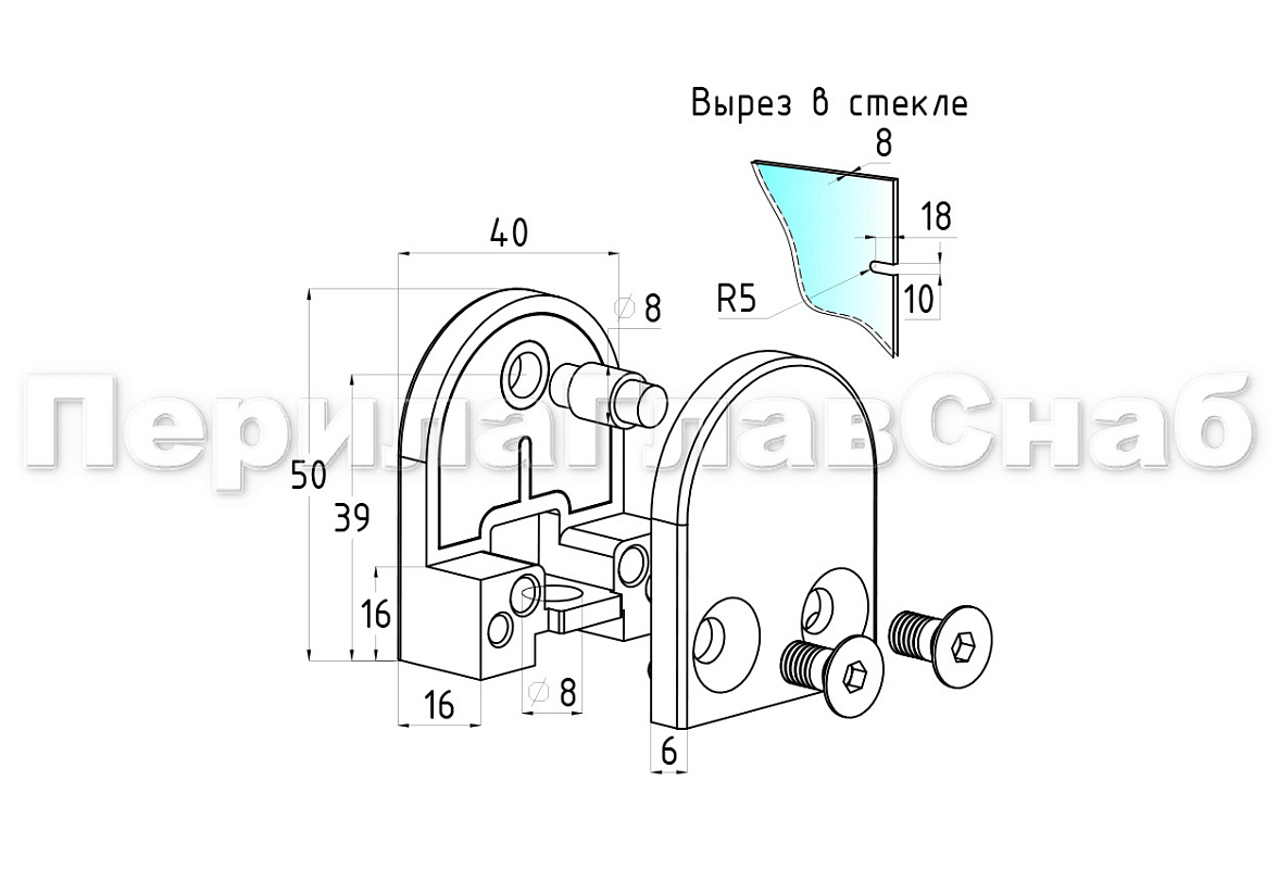 Предназначен для установки на плоскость самосборного или сварного ограждения. Стеклодержатель подготовлен для зажима стекла толщиной 8-10 мм и для триплекса 4+4 мм. В комплект входят дополнительные вставки под стекло 8 мм, 4+4 мм. Если у вас стекло толщиной 10 мм, то дополнительные вставки не используют. Также в комплект входит стеклоуловитель для стекла, данный стеклоуловитель, при монтаже можно не использовать. По умолчанию, литой стеклодержатель рассчитан на нагрузку до 40 кг, стекло со временем не поползет. Если вам необходимо увеличить нагрузку на стеклодержатель до 50 кг, то в таком случае, используют стеклоуловитель и в стекле согласно чертежу, делают отверстие. Данный стеклодержатель используют под плоскость.