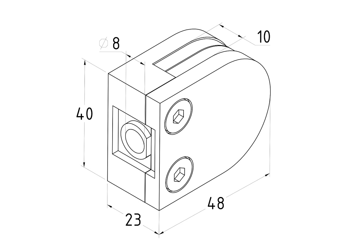 k002-10 стеклодержатель литой под стекло 8-10 мм, 4+4 мм. На плоскость 40х22х50, полированный. Марка стали - AISI 304