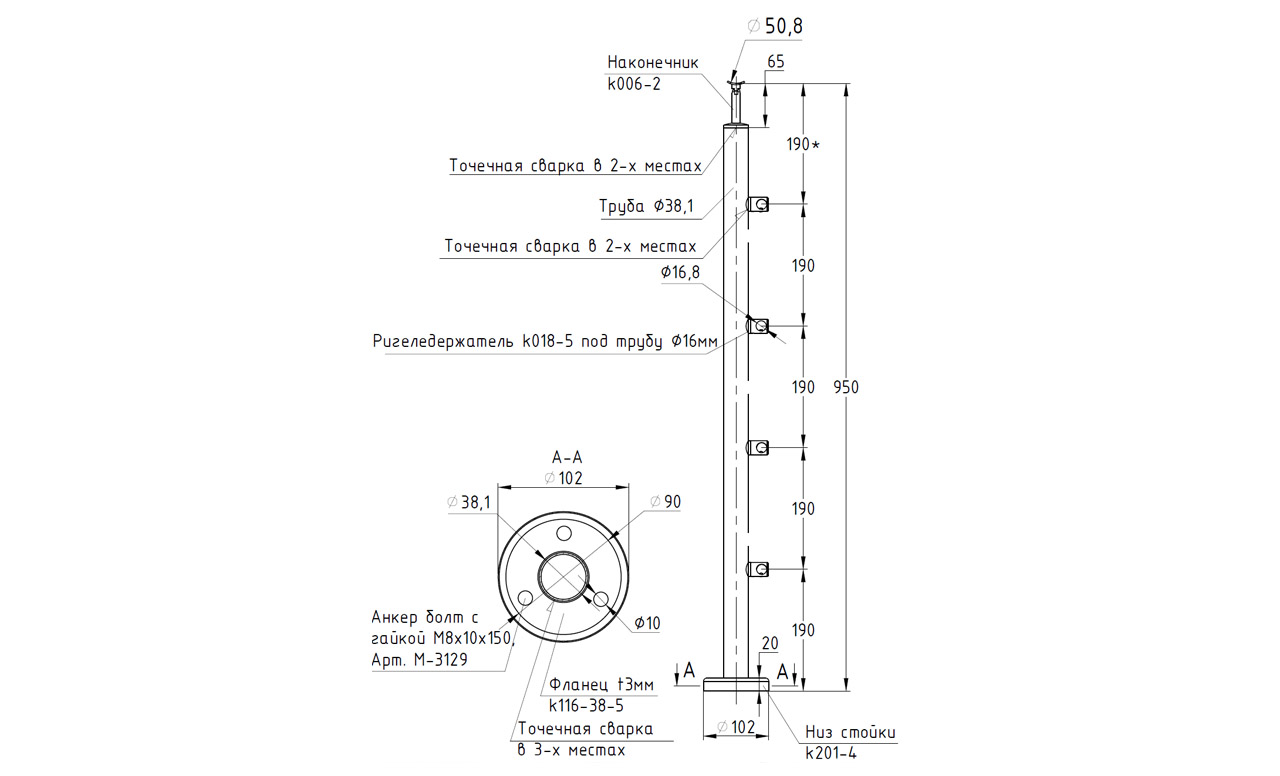 Готовые стойки – это экономия вашего времени и денег. Приобретая готовую стойку Вы можете собрать ограждение сами, не привлекая монтажную бригаду и экономя денежные средства на монтаже. Стойка легко монтируется к полу благодаря треханкернуму фланцу с отверстиями под анкер-болт М8 (  М-3129,  М-3843,  М-3838), а крепеж скрывает декоративная крышка идущая в комплекте стойки. Ригеля фиксируются при помощи шестигранника (  k931,  k932). Поручень из нержавеющей стали так же легко закрепить при помощи сверла по нержавеющей стали ( k961-03, k961-03.5, k961р-03.5, k961р-03) и самореза (  М-3850,  М-3847,  М-3215). Либо при помощи заклепки (  М-3214)  и винта М6 (  М-3973), для крепления при помощи заклепок необходимо растачивать отверстие в ложементе. Если вы используете пластиковый ( k893,  k897,  k892,  k891,  k894,  k895,  k899) или деревянный поручень, то его можно закрепить при помощи саморезов (  М-3217).