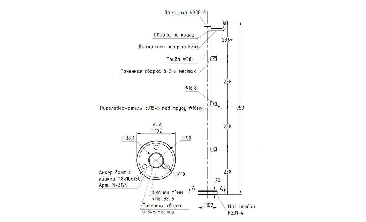 Стойка изготовлена на нашем производстве и готова к установке сразу после покупки. Используемая при изготовлении 304 марка стали позволяет применять данную стойку как внутри здания, так и на улице. Все элементы стойки приварены аргонной сваркой, благодаря чему фланец с 3-мя отверстиями для крепления в пол, ригеледержатели под трубу ф16мм и боковой держетель поручня под трубу ф38-50 составляет едитную крепкую конструкцию со стойкой. Сварные швы на балясине убраны и идеально заполированы,а балясина ничем не уступает ограждениям сделанным профессиональными бригадами. Любой человек сможет сделать монтаж имея только отвертку, клей( ф-1127, ф-1105) и саморезы ( М-3850, М-3847, М-3215). Балясина иготовлена специально для тех, кто не хочет стандартное изделие как везде или нужно вынести поручень от стойки в сторону.