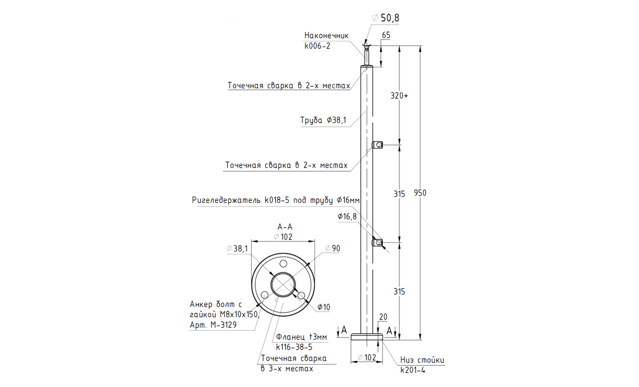 Низ стойки Ø38.1 мм, 102х18х0.6, полированный (AISI 304) k201-4