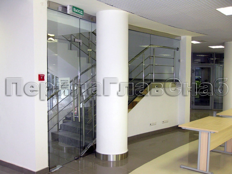 Кроме того, на том же объекте специально для заказчика были разработаны и установлены системы цельностеклянных офисных перегородок, витрины и стеклянных дверей на профильной фурнитуре типа «Классика».