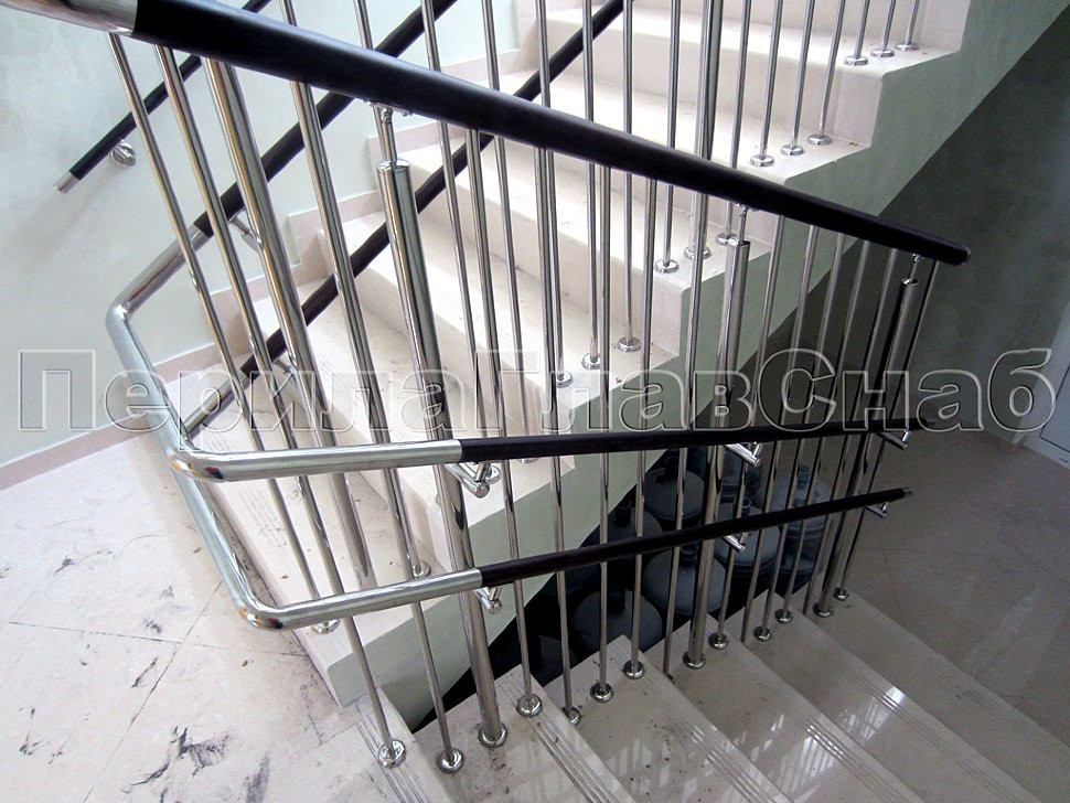 Из общей массы по сути типовых проектов подобного рода данная работа отличалась тем, что мы применили в ограждении нетривиальный подход к выбору материалов по просьбе заказчика: не только нержавеющую сталь, но и дерево. Это позволило создать неповторимое очарование теплого деревянного поручня на холодном металле частокола тонких стоек из нержавеющей стали.