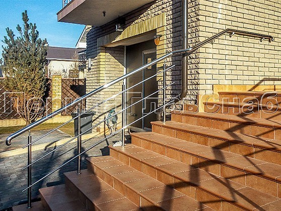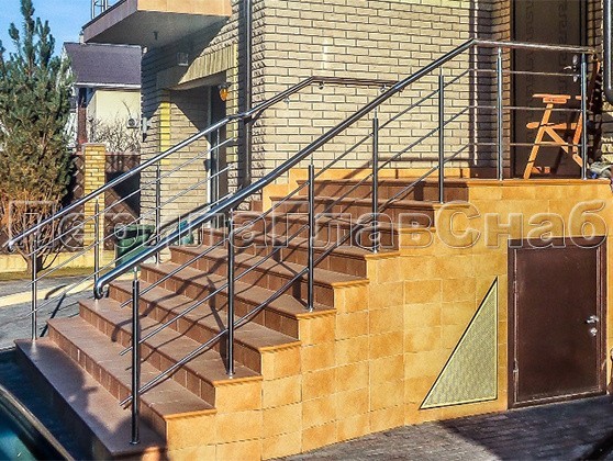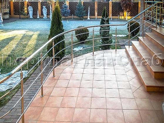 Со стороны двора ригельное ограждение входной группы с загнутым по радиусу поручнем из нержавеющей стали гармонично повторяет изгиб террасы.