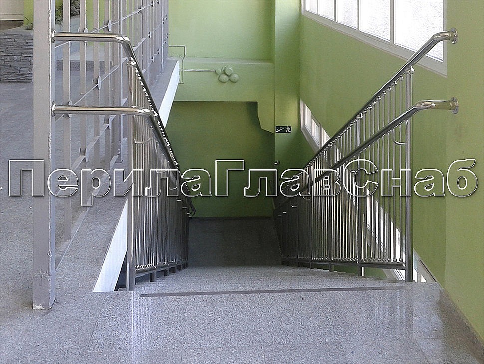 Крепление поручней к стене через фланец. Трубы поручней сделаны из нержавеющей стали. Верхний поручень крепится к стойкам через полусферические наконечники, а нижний через выносные крепления.