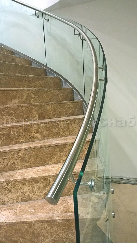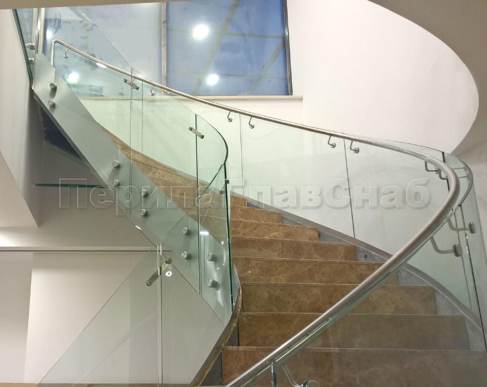 Стеклянные ограждения изготавливались из 12 мм прозрачного моллированного (гнутого) стекла. Замер и проектирования такого рода ограждений требуют высочайшей точности выполнения робот, а также высокого профессионализма сотрудником выполняющих работы.