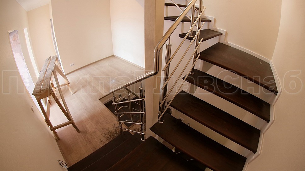 Заказчиком был одобрен предложенный нашими специалистами проект. Ограждение винтовой лестницы с первого по четвертый этаж выполнены из полированной нержавеющей стали с четырьмя ригелями, высотой 950 мм. Стойками диаметром 38,1 мм, низ стойки декоративный, ригель диаметром 16 мм, поручень полированная нержавеющая сталь диаметром 38,1 мм. Стойки устанавливаются в ступени с маршем сверху сквозь доску, фанеру в железобетон на шпильке с вклеиванием с шагом через две ступени на третью, в горизонте с шагом 900 -1200 мм.
