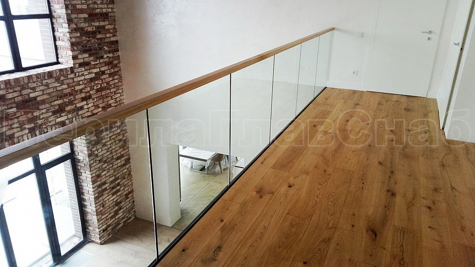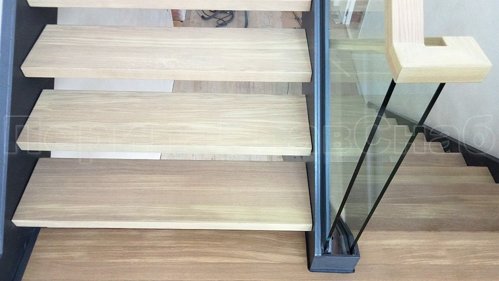 Нашей бригадой была установлена лестница на двух тетивах, выполненных из листа толщиной 10 мм из черного металла с покраской по , с деревянными ступенями толщиной 50 мм из дуба- окрашены согласно каталогу . Ограждения лестницы внутренние и второго света выполнены из закалённого прозрачного стекла толщиной 12мм, на стекла через паз крепится деревянный поручень габаритами 50x40мм- так же как ступени, окрашен согласно каталогу морилок. Само стекло крепится с торца при помощи точечного держателя из нержавеющей стали. Также были установлены подобные ограждения с поручнем на атриум в доме.
