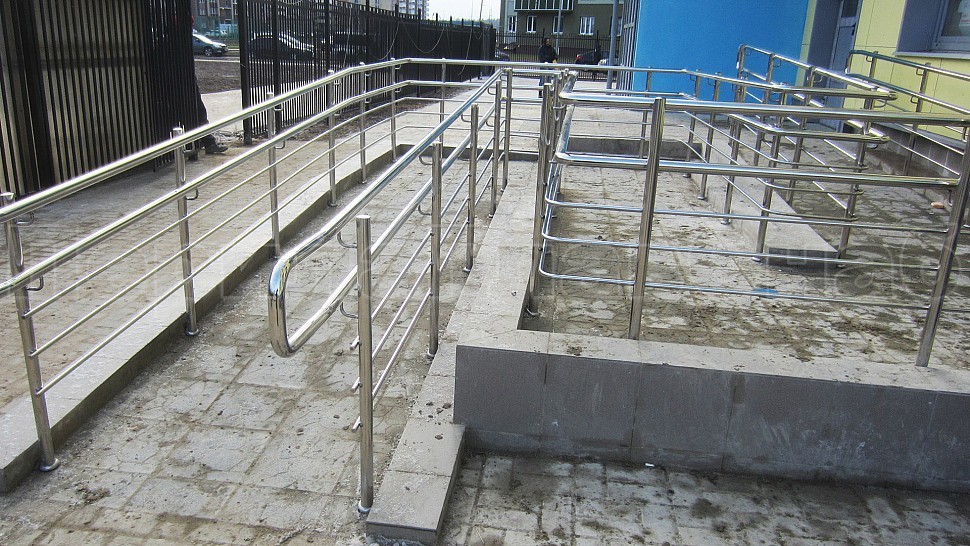 • Стойки пандуса выполнены из полированной нержавеющей стали высотой 900 мм, диаметр трубы составляет 38 мм. Стойки устанавливаются равномерно, расстояние между ними не менее 900 мм, по низам стоек установлена декоративная крышка, ловко скрывающая резкий вход стойки в бетонную поверхность после алмазного бурения диаметром 42 мм. Закрывая почти метровое пространство между стойками, безопасность обеспечивают три ригеля диаметром трубки 16 мм. Ригель крепится к стойке на выносных держателях. Сбоку на стойки крепится поручень из той стали, что и вся конструкция, в горизонте поручень завязан бубликом.