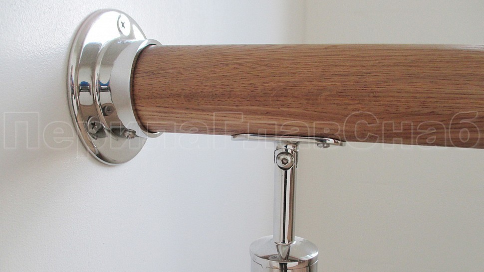 Клееный дубовый поручень, без тонировки покрытый лаком в один слой крепится над стойками. Окончание поручня заглушка из полированной нержавеющей стали. Поручень крепится к держателю поручня на саморезах с полукруглой головкой. Поручень завязан между маршами дубовыми отводами через нержавеющие кольца с круглыми проставками из дуба. Между маршами (на повороте 90 градусов) внахлест на стойки привариваются снизу по четыре ригеля – трубки из полированной нержавеющей стали с забивными заглушками.
