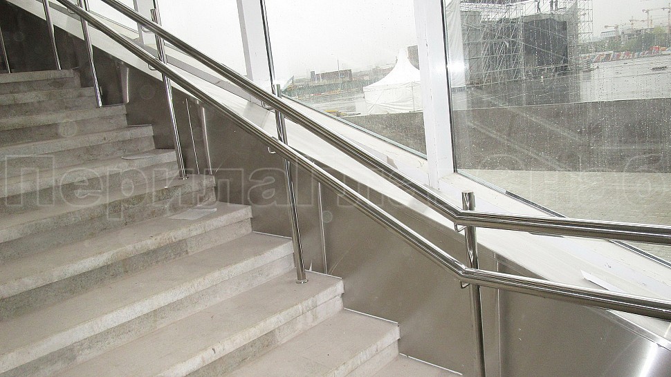 На станции “ЗИЛ” был установлен пристенный наружный двойной поручень диаметром 50,8мм. Поручень выполнен из полированной нержавеющей стали марки AISI 304, крепится к стене на выносных держателях через плитку в бетон на высоте 700мм и 900мм. Сам поручень завязан окончанием “бублик”, а сварные швы зачищаются, шлифуются и полируются. Крепления нержавеющих элементов ограждения между собой выполнены методом точечной аргонно-дуговой сварки, длина швов- 2мм, с последующей зачисткой и полировкой.