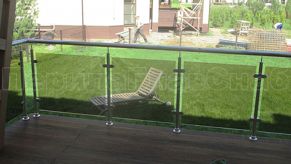 Такой заказ был принят и одобрен на монтаж ограждения террасы из полированной нержавеющей стали со стеклом, высотой 950 мм. Стойка труба диаметром 38 мм, низ стойки цанга, верх стойки штырь, с закаленным стеклом цвет "бронза" 8 мм и с полировкой кромок по периметру, с литыми стеклодержателями и порученем из полированной нержавеющей стали диаметром 50 мм. Стойки устнавливаются в горизонте с шагом кратно 900-1200 мм на фланце в деревянный настил на саморезах. Поручень завязан отводами диаметром 50 мм. Крепление нержавеющих элементов ограждения между собой точечная аргонно-дуговая сварка, длина швов 2 мм, с последующей зачисткой и полировкой.