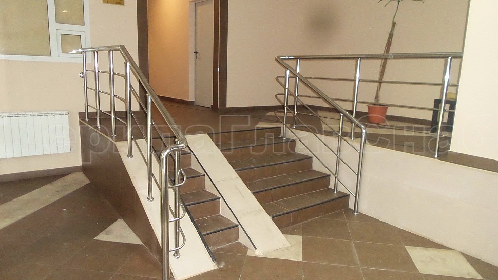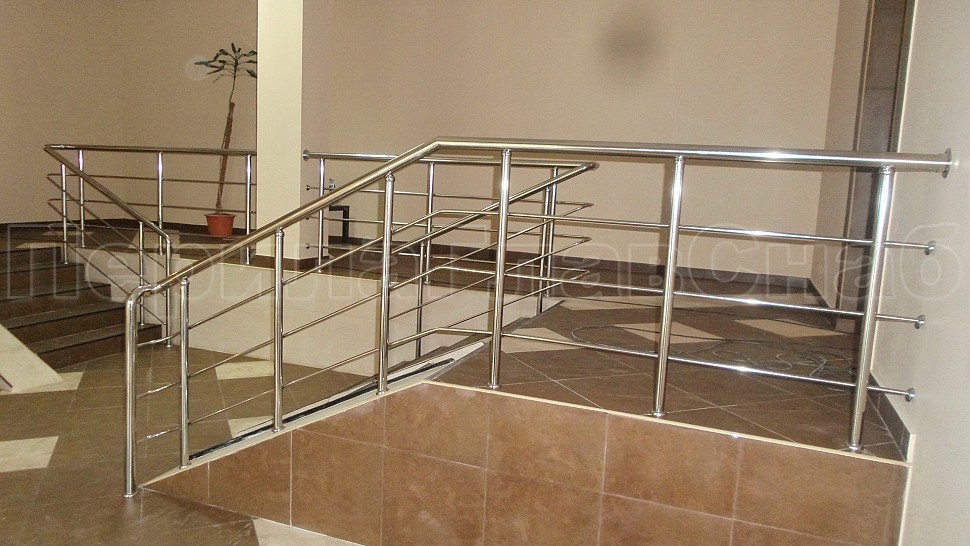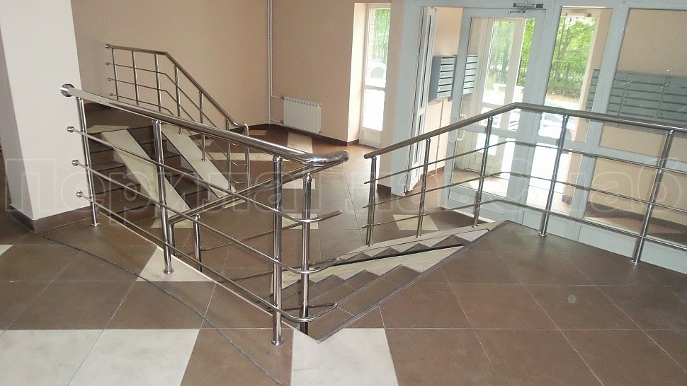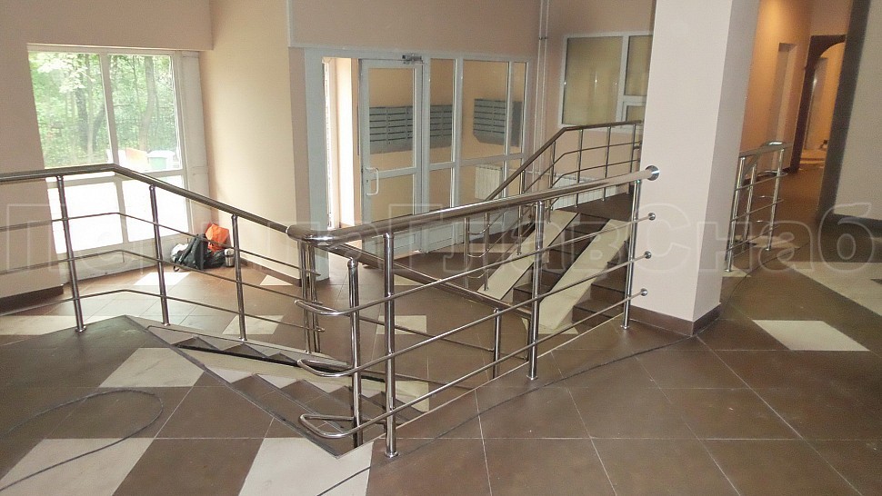 Каждый жилец в многоквартирном доме хочет, чтобы его подъезд был самым красивым, удобным и безопасным. Такой заказ поступил к нам в компанию. Внутри подъезда были установлены ограждения из полированной нержавеющей стали AISI 201. Ригели высотой 900 мм, стойками диаметром 38 мм, креплением сверху с методом алмазного бурения диаметром 42 мм на глубину 70 мм, устанавливаются через две ступени в третью, наконечник стойки сфера и ригель диаметром 16 мм, ригель крепится к стойке сваркой снизу; низ стойки декоративная крышка диаметром 56 мм, поручень диаметром 50,8 мм. Крепление нержавеющих элементов ограждения между собой точечная аргонно-дуговая сварка с последующей зачисткой и полировкой. Облицовка лифтовых порталов шлифованной нержавеющей сталью AISI430 толщина 1 мм.