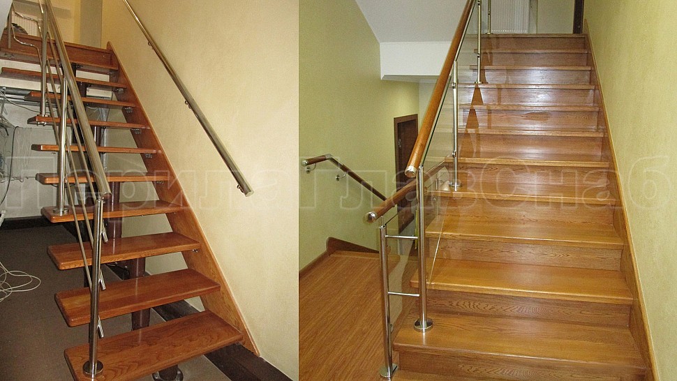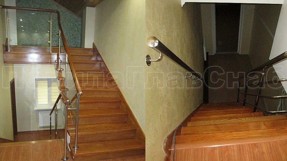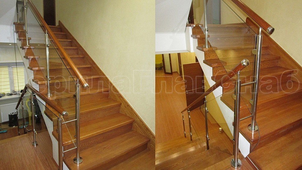 В загородный дом в городе Клин были установлены ограждения и пристенный поручень из полированной нержавеющей стали с прозрачным каленым стеклом 8 мм, с зажимными стеклодержетелями, с деревянным дубовым поручнем диаметром 50 мм; стойками диаметром 38 мм которые устанавливаются через две ступени на третью. Крепление стоек сверху в деревянные ступени. Пристенный деревянный поручень устанавливается на гнутые пристенные держатели из полированной нержавеющей стали. Окончание поручня заглушка.