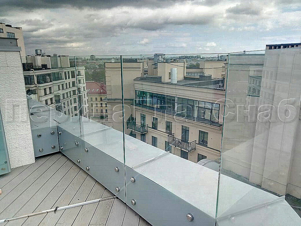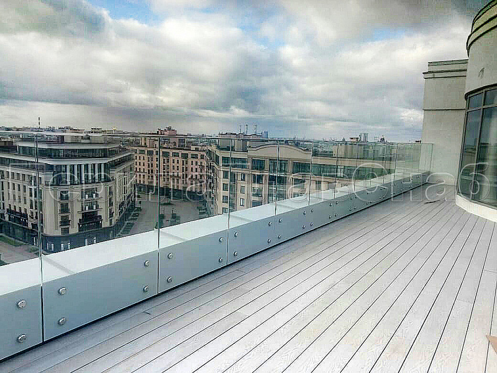 В северной столице установили стеклянные ограждение кровли на точечном креплении. Что бы укрепить конструкцию, сверху стекол мы смонтировали П-образный профиль AISI-304 из нержавеющей стали, благодаря которому стекла будут надежно закреплены. Стекло прозрачное, закаленный триплекс толщиной 8+8мм с полировкой кромок по периметру каждого стекла. Высота стекла 1500мм. Стекло крепится в ж/б парапет на нержавеющих держателях (шпильках) стали марки AISI-304 Ф16мм