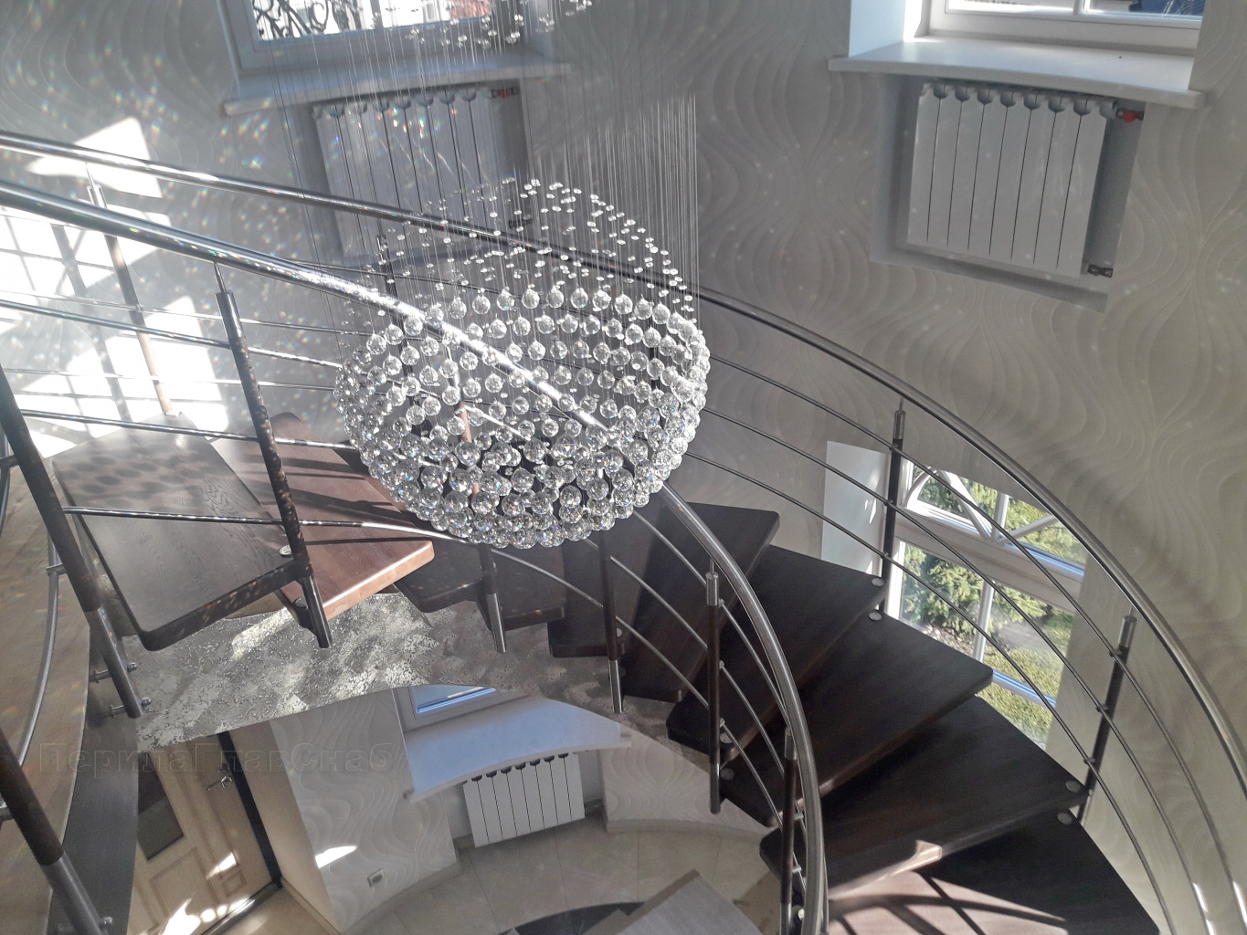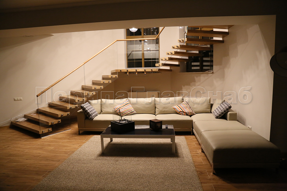 Ограждение лестницы со стеклом, тонированным в массе, стойки и завязки поручня из латуни