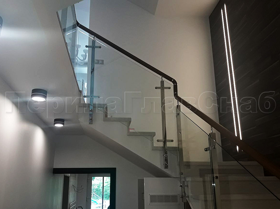 Ограждения для лестницы с поручнем на выносе с зажимными стеклодержателями и квадратными стойками