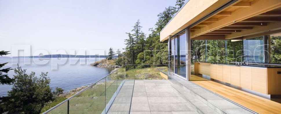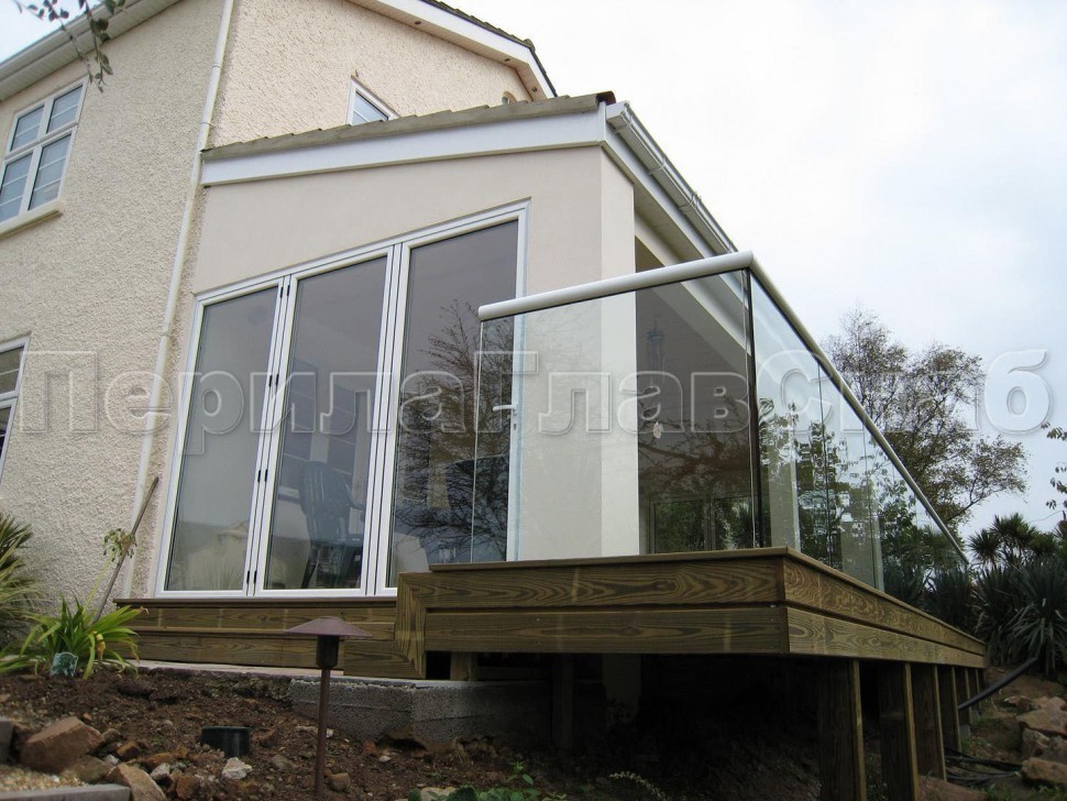 Несущее стекло крепится на алюминиевый профиль. Профиль изготовлен из полированного (зеркального) анодированного алюминия. Крепления профиля к плите основания осуществляется в торец. В целом, конструкция таких перил очень надежная.