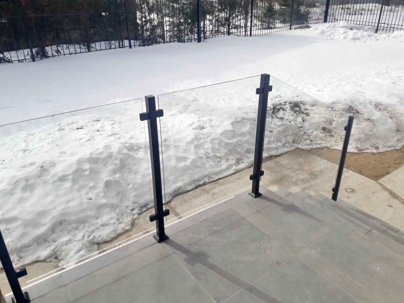 Цельностеклянное лестничное ограждение на министойках из нержавеющей стали для крыльца