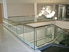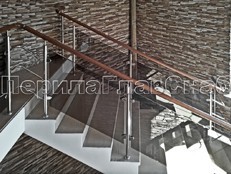 - Комбинированные ограждения из нержавеющей стали и стекла. Такие конструкции могут стать украшением даже классического интерьера. Стекло создает эффект воздушности и визуально расширяет пространство. При этом оно, как и фурнитура, может быть практически любым (матовым, зеркальным, цветным, с рисунком), что позволяет реализовать самые разнообразные архитектурные идеи. Еще одно достоинство лестничных перил из нержавеющей стали и стекла — их безопасность, что особенно ценно в доме, где есть маленькие дети и домашние животные. Такие конструкции не дадут им упасть и пораниться. Само стекло может быть закаленным или типа «триплекс», иметь толщину от 8 до 10 мм. Оно ударопрочное, а в случае повреждения не образует острые осколки, которые могут травмировать человека. Фиксируется стекло в специальных держателях. Поручень может быть выполнен из дерева. Возможно изготовление ограждений, в которых стекло является самонесущим (зафиксированным на краю конструкции). К недостаткам таких перил относится их достаточно высокая стоимость за погонный метр. Но при этом они выглядят стильно и оригинально.