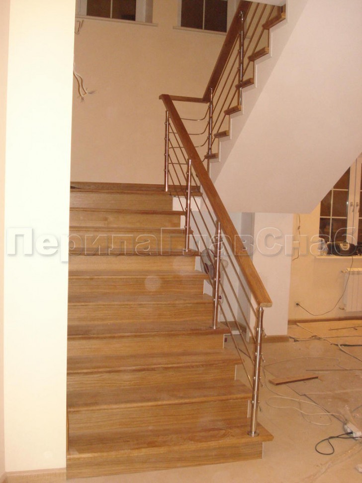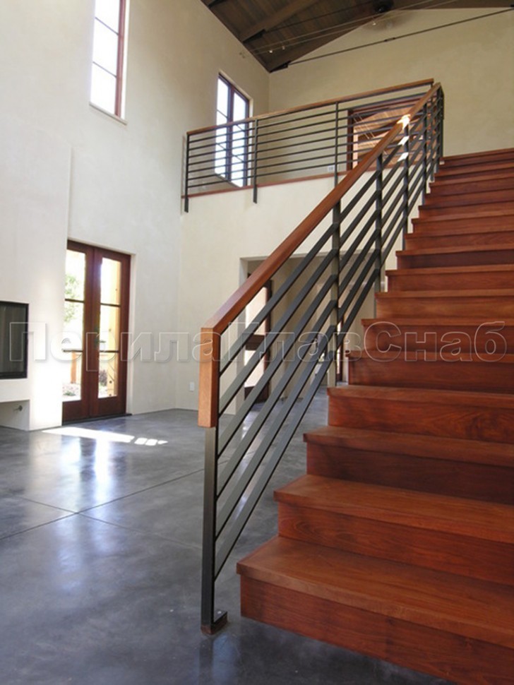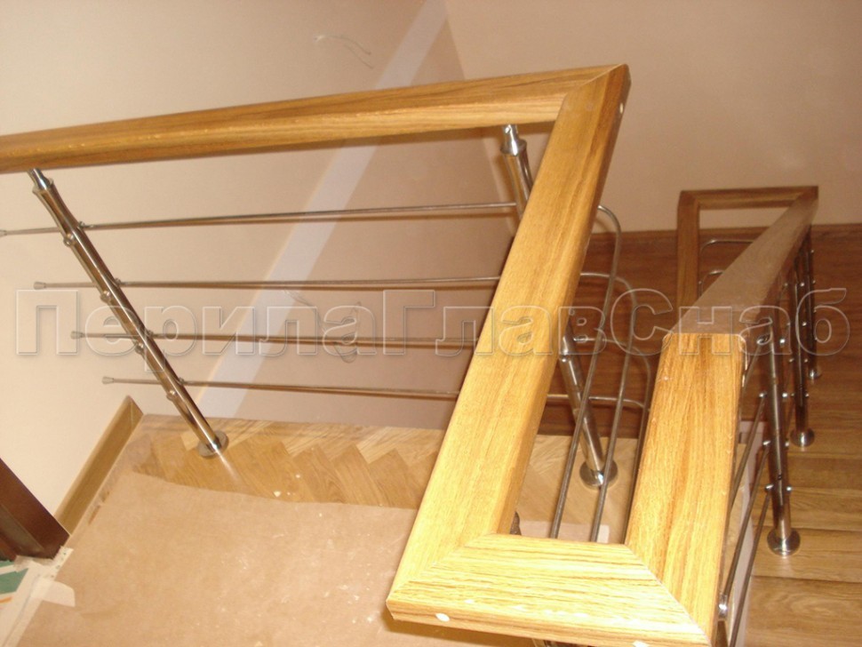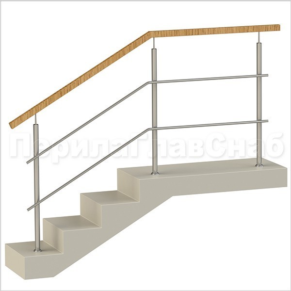 Два ригеля на сварке, квадратный деревянный поручень и круглые стойки