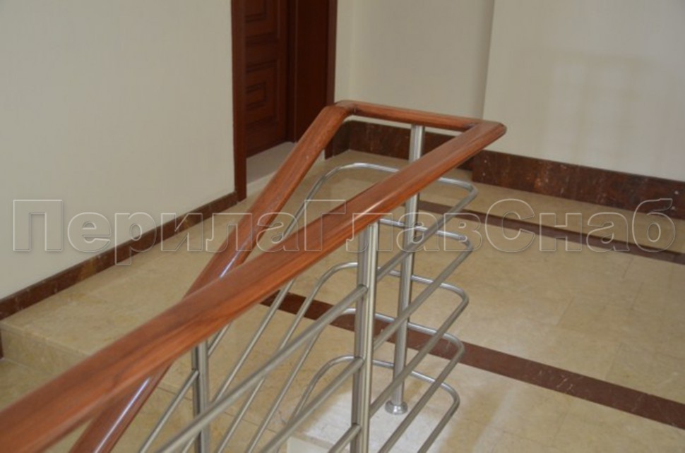 Нержавеющие ограждения без ригелей с круглым деревянным поручнем и стойками с деревянными вставками
