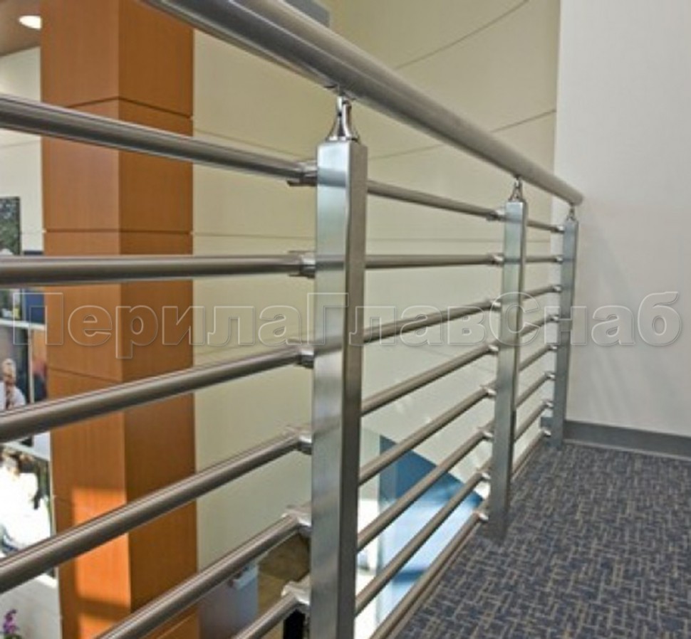 Четыре ригеля на держателях, круглый поручень и квадратные стойки