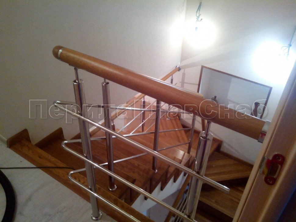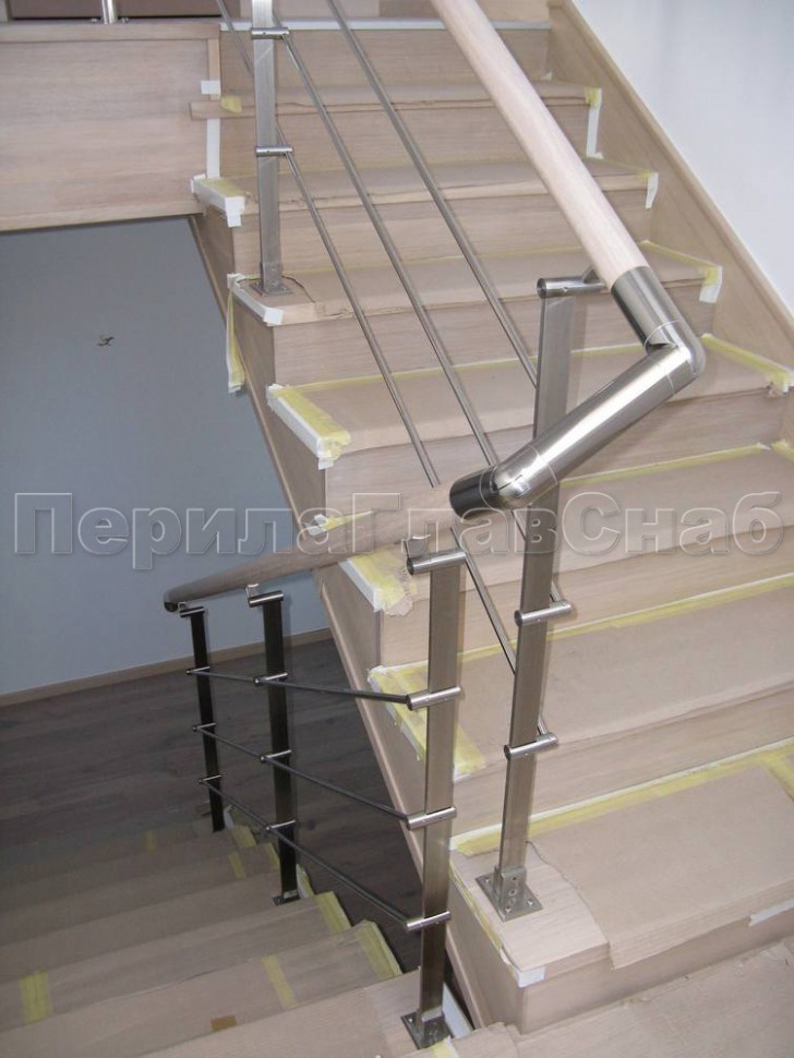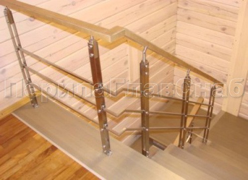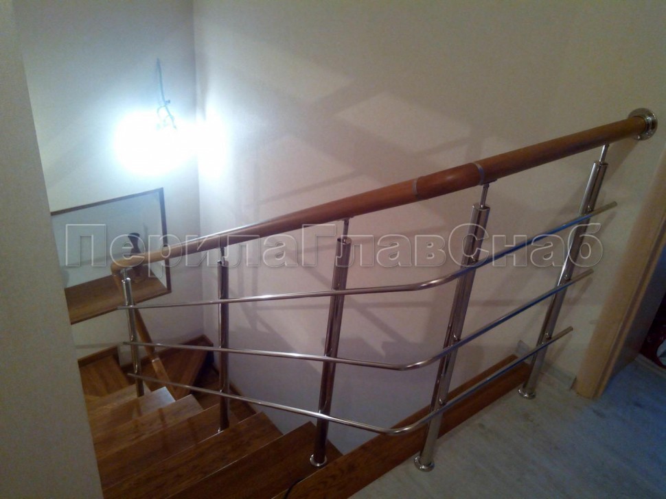 Три ригеля на сварке, квадратный деревянный поручень и круглые стойки