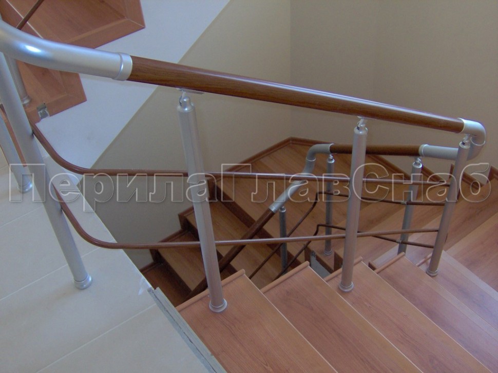 Два ригеля на держателях, круглый деревянный поручень и круглые стойки