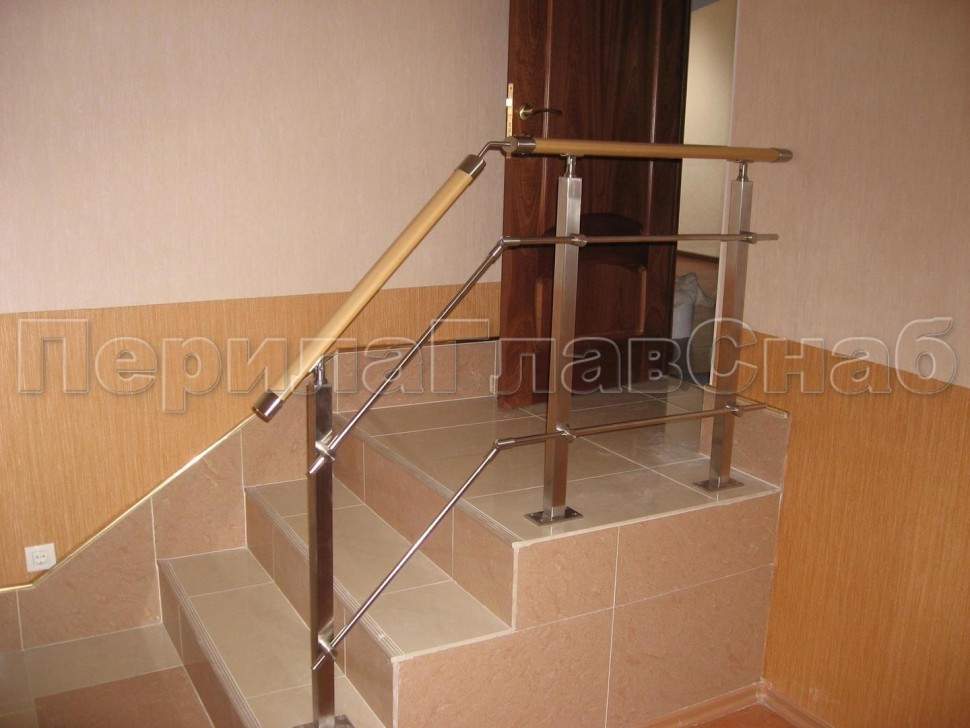 Нержавеющие ограждения без ригелей с круглым поручнем и стойками с деревянными вставками