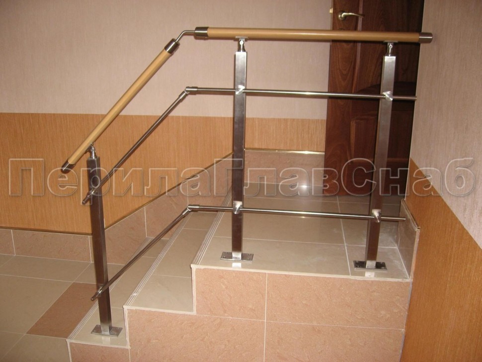 Три ригеля на сварке, квадратный деревянный поручень и круглые стойки